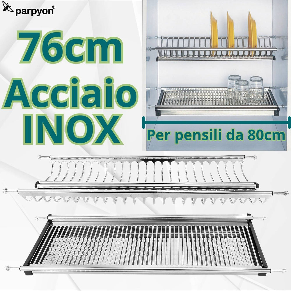 SCOLAPIATTI DA 76: in Acciaio INOX Aisi 430 composto da n 2 ripiani + Vaschetta raccogli gocce. Facile da installare grazie all'innovativo aggancio a Molla che si trovano nei laterali del colapiatti, in 4 punti che permettono una maggiore stabilità evitando pericoli di caduta.