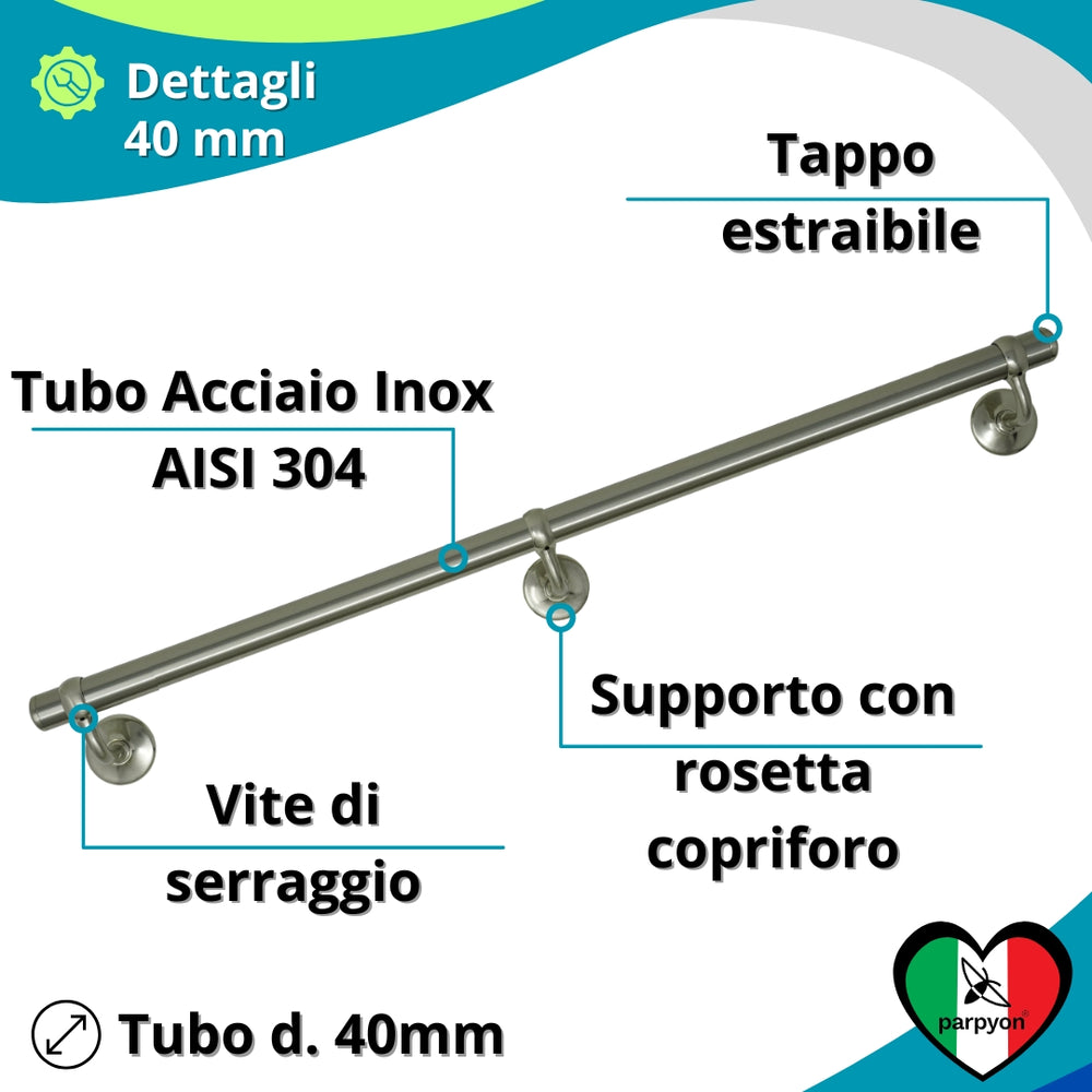 CORRIMANO PARPYON V42: Il Kit Corrimano Parpyon è un PRODOTTO 100% ITALIANO Composto da Tubo Corrimano in Acciaio INOX d. 32mm con finitura Satinata Supporti a muro Mod. V42R - tappi finali e tasselli e viti per il fissaggio.
