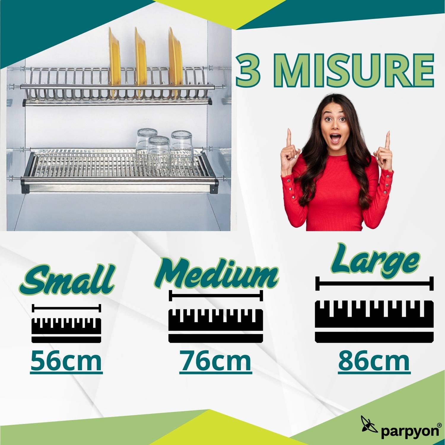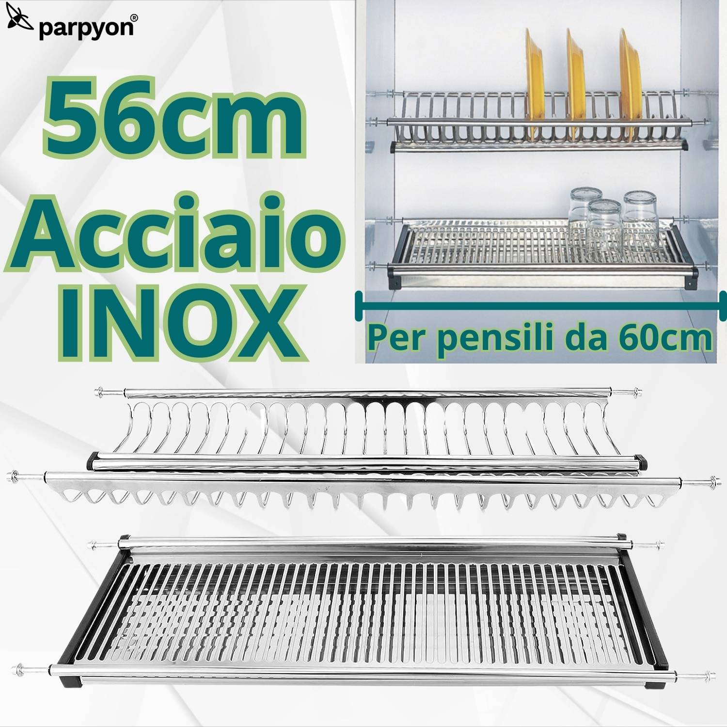 SCOLAPIATTI DA 56: in Acciaio INOX Aisi 430 composto da n 2 ripiani + Vaschetta raccogli gocce. Facile da installare grazie all'innovativo aggancio a Molla che si trovano nei laterali del colapiatti, in 4 punti che permettono una maggiore stabilità evitando pericoli di caduta.