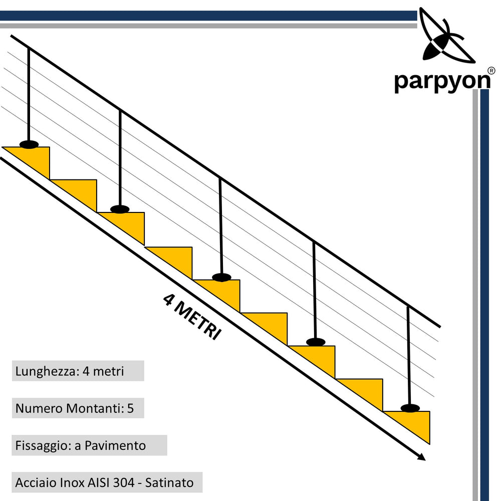 Ringhiera Parpyon Ringhiera in Acciaio Inox AISI 304 [per Interno] - Lunga 4 Metri Lineari con fissaggio a PAVIMENTO